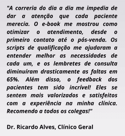 Em um mercado cada vez mais competitivo, oferecer um atendimento que vai além do básico é fundamental. Seu e-book detalha como a personalização, a escuta ativa e a resolução eficaz de conflitos podem transformar a experiência do paciente, gerando lealdade e indicações. Ao implementar as técnicas descritas, sua clínica não apenas atrairá mais clientes, mas também os transformará em verdadeiros promotores da sua marca.